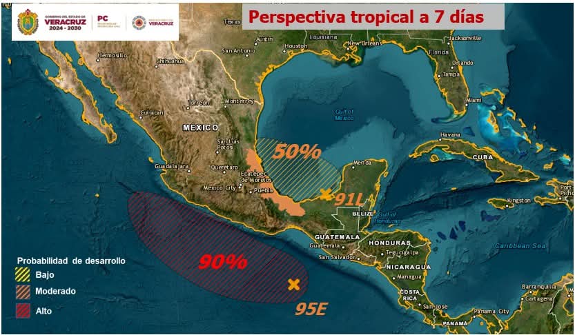 Xalapa, Ver.- 28 de junio 2025. Protección Civil del Estado de Veracruz,  informa que se mantiene en vigilancia el posible desarrollo de dos ciclones tropicales: uno sobre el Pacífico Oriental (95E), y otro en el Golfo de México (91L), tienen probabilidad alta y moderada de evolucionar a ciclón en 7 días respectivamente.