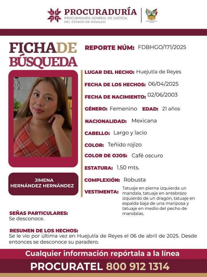 La víctima fue identificada como Jimena Hernández Hernández, de 21 años, reportada como desaparecida desde el 6 de abril. Su ficha de búsqueda había sido emitida por la Procuraduría de Justicia de Hidalgo.