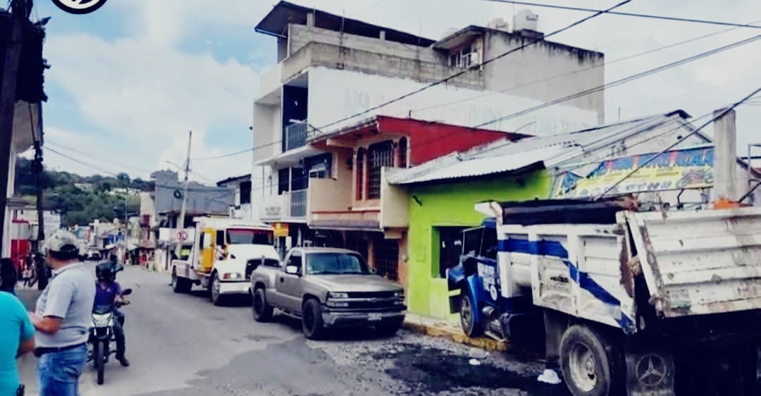 De acuerdo al reporte un trailer se quedó sin frenos tras una falla mecánica en la pendiente de la carretera federal Atzalan,-Tlapacoyan ya sin control impacto por la parte trasera aún camión de volteo cargado de grava mismo que al impacto tan fuerte se metió aúna casa provocando daños en su estructura.