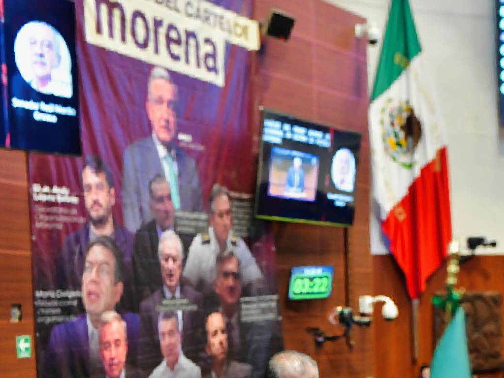 🚨En el pleno del Senado mexicano, legisladores del PRI desplegaron una manta en la que se puede leer: «El narco-gobierno que padece México», esto por el supuesto «Cártel de Morena».