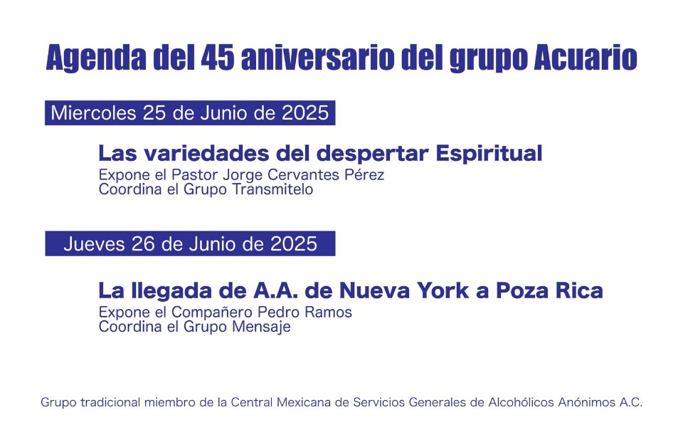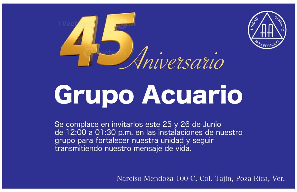 Con motivo de su 45 aniversario el grupo acuario sigue invitando a las personas que consideren que pudieran tener problemas con su manera de beber a que se acerquen por información y decidan por ellos mismos si su asistencia pudiera tener un beneficio en sus vidas.