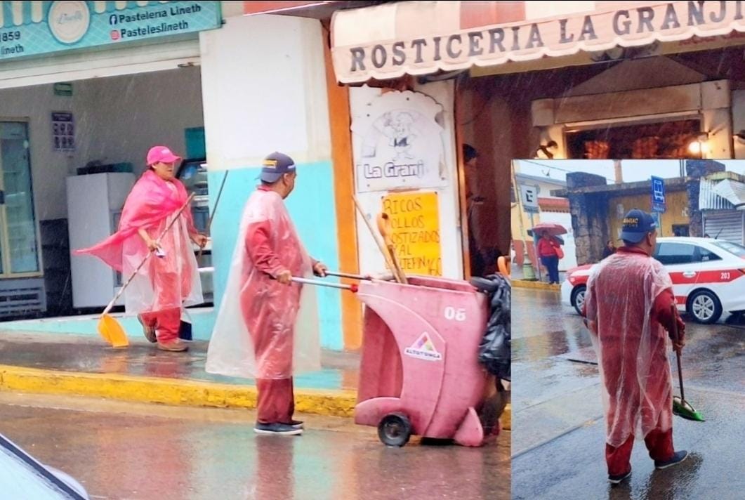 La falta de equipo para poder realizar sus labores en esta temporada de lluvias, obliga a los trabajadores de la limpia pública a utilizar «naylon» para protegerse de las inclemencias del tiempo..
