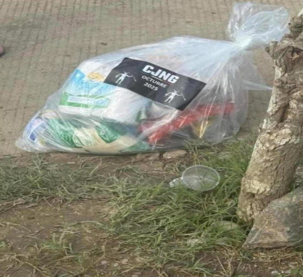 En el video difundido se puede escuchar a uno de los sujetos encapuchados decir “de parte del Cártel Jalisco Nueva Generación. De parte del Cártel Jalisco Nueva Generación”, a la par de que ciudadanos se arremolinan en torno a un vehículo para recibir la despensa.