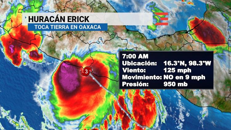 El Huracán Erick tocó tierra en el extremo oeste de Oaxaca, México sobre las 05:30 am, como Categoría 3, con vientos máximos sostenidos de 205 km/h y rachas de 250 km/h. En Puerto Escondido provocó muy fuerte oleaje, marea alta, lluvia e inundaciones costeras.