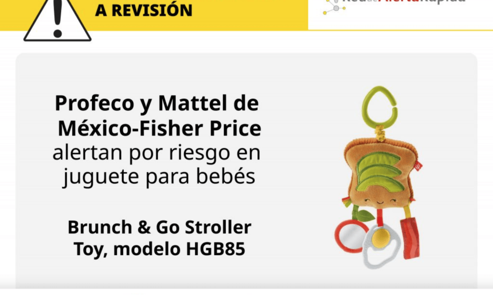 Se trata del Brunch & Go Stroller Toy Pretend Food Baby Toys, fabricado por Mattel de México bajo la línea Fisher Price, el cual fue llamado a revisión por representar un riesgo de asfixia en bebés.