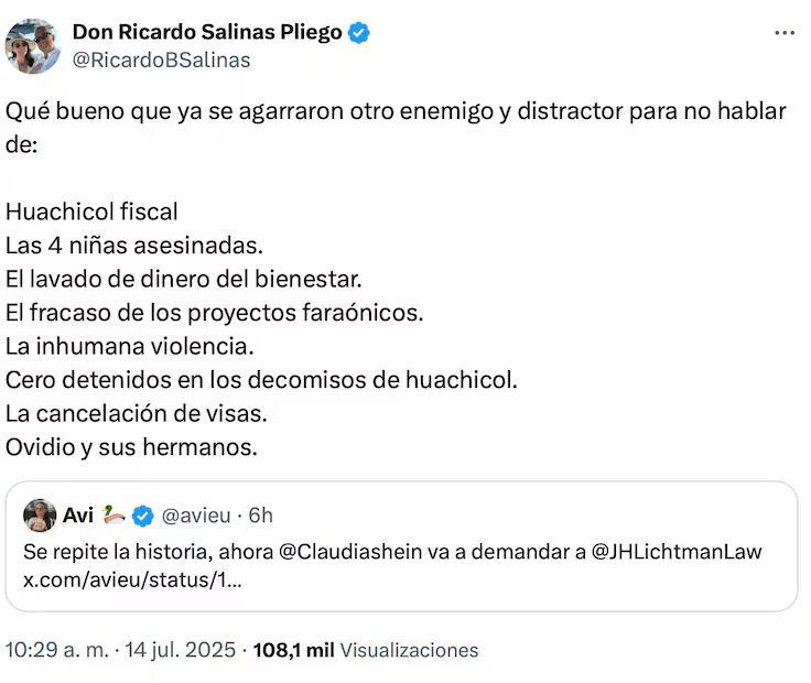 “Que bueno que tienen nuevo enemigo”: Salinas Pliego feliz por la demanda de Sheinbaum al abogado de Ovidio