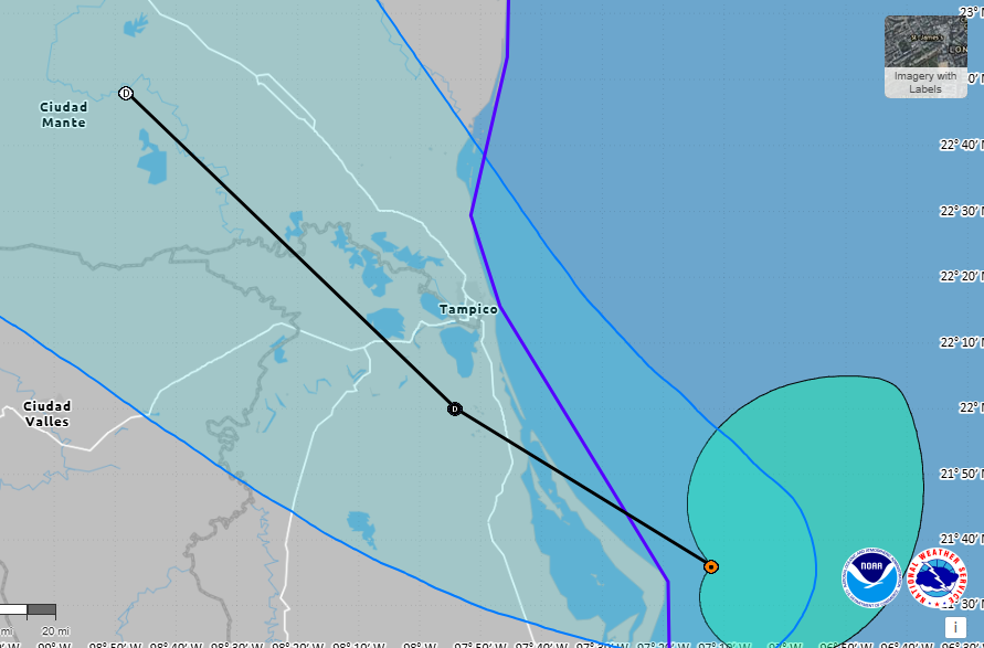 Además, se esperan vientos de hasta 110 km/h y oleaje de hasta cuatro metros en las costas afectadas del Golfo de México, así como deslaves, desbordamientos e inundaciones en zonas bajas y afectaciones en los estados de San Luis Potosí, Hidalgo y Tamaulipas con lluvias intensas y torrenciales