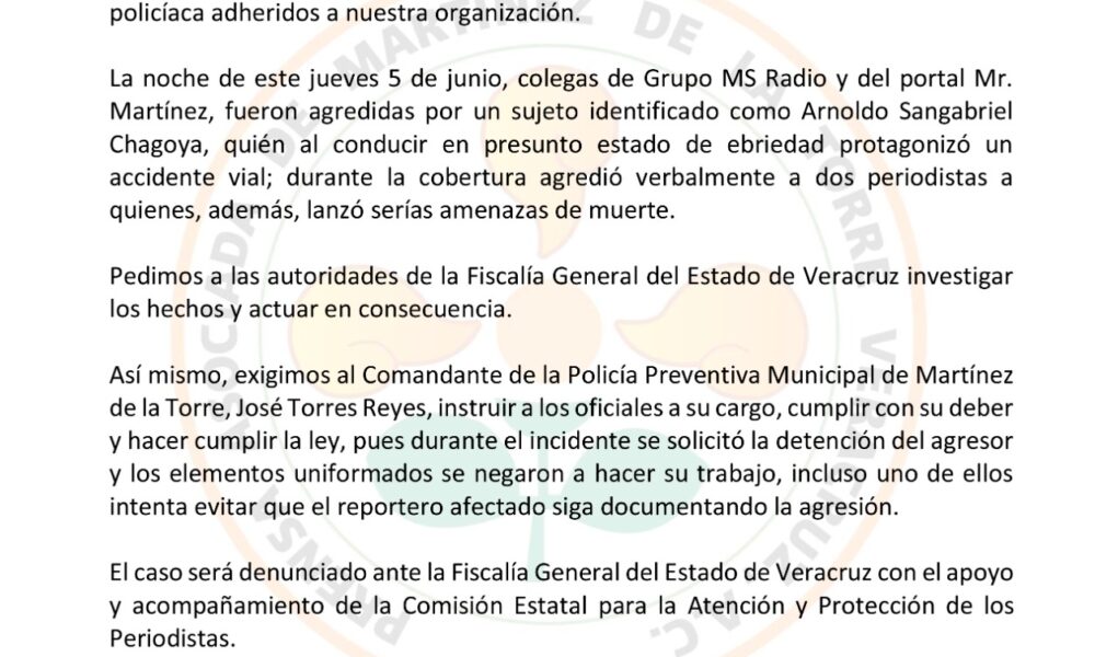 La organización de periodistas Prensa Asociada de Martínez de la Torre reprueba enérgicamente la agresión de la que fueron objetos dos periodistas de la fuente policíaca...