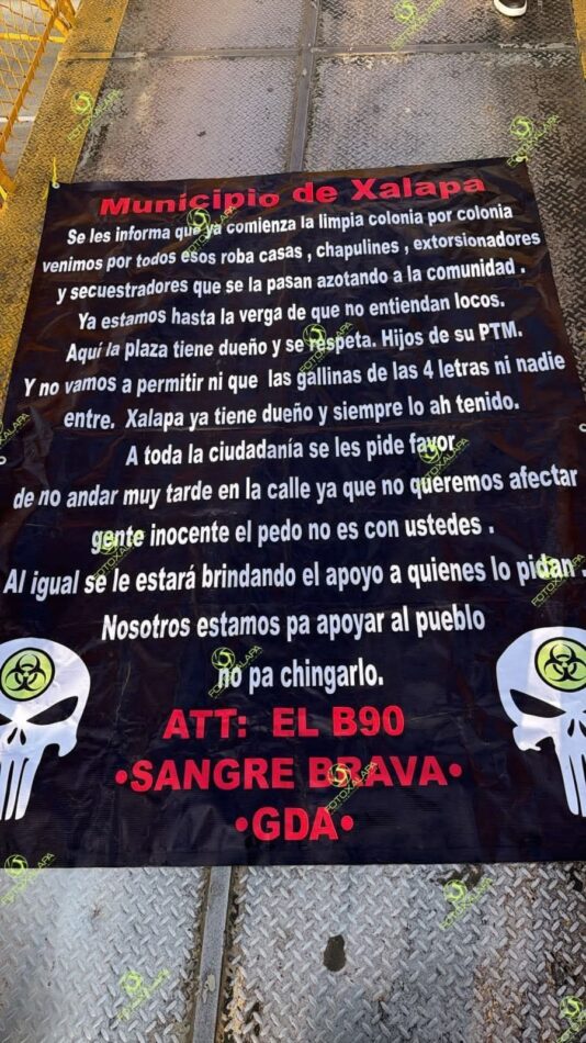 Xalapa, Ver.- La capital veracruzana despertó este viernes con un clima de tensión tras el hallazgo de una «narcomanta» colgada en el puente peatonal ubicado frente a Plaza Cristal. El mensaje, firmado por un presunto grupo delictivo autodenominado B90 «Sangre Brava», desató la alerta entre ciudadanos y autoridades.